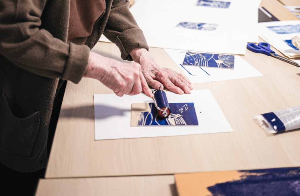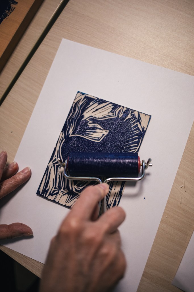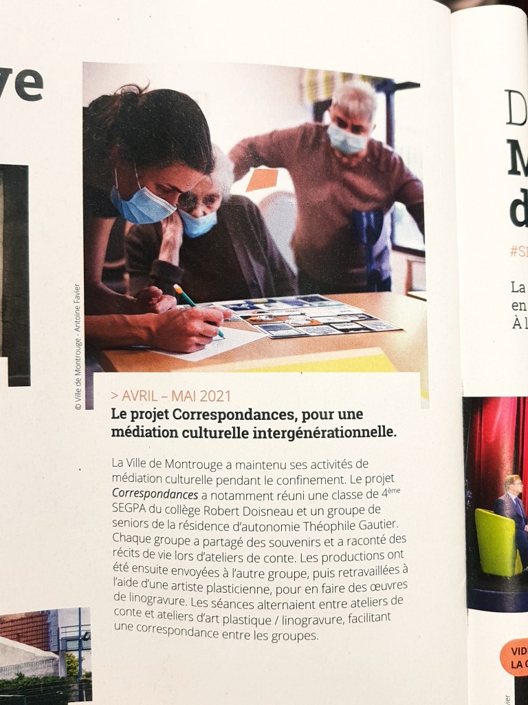 Ateliers croisés de linogravure avec un groupe de senior d’une résidence autonome et un groupe d’élèves de 4ème SEGPA dans le cadre du projet « Correspondances » impulsé par le Beffroi de Montrouge.