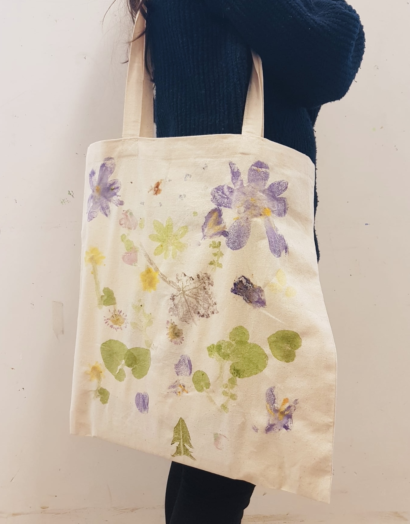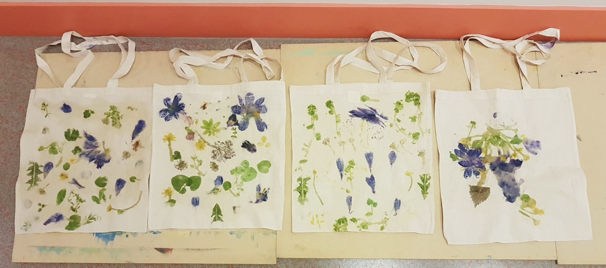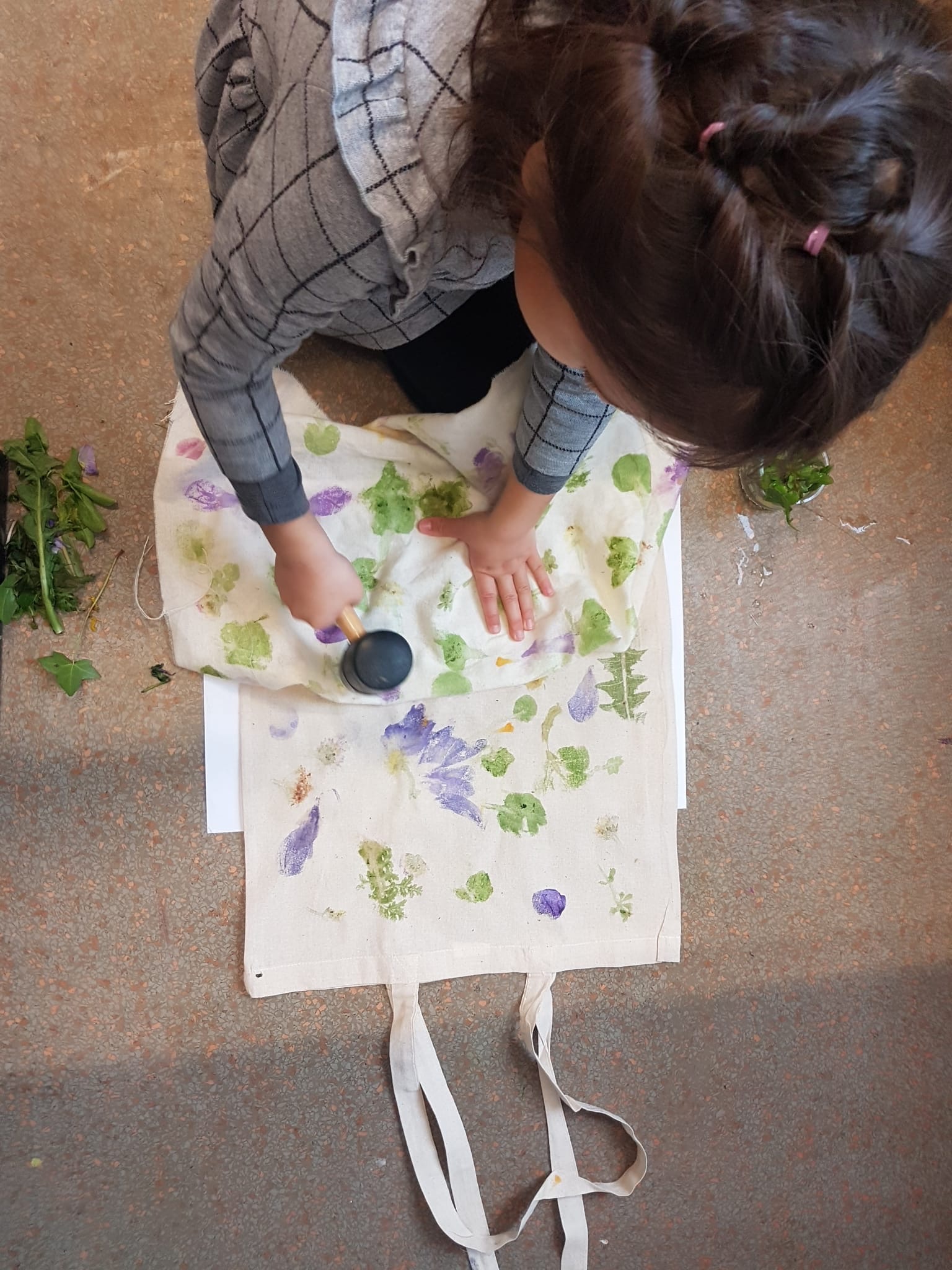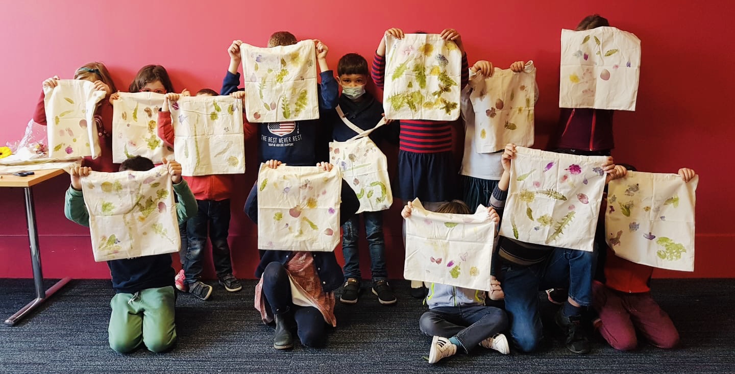 Nous cueillons des feuilles, herbes et fleurs lors d’une ballade dans un parc puis nous imprimons les fruits de notre récolte sur un sac en coton blanc, en tapant au marteau. L’empreinte du végétal et la couleur s’imprime sur le textile!
