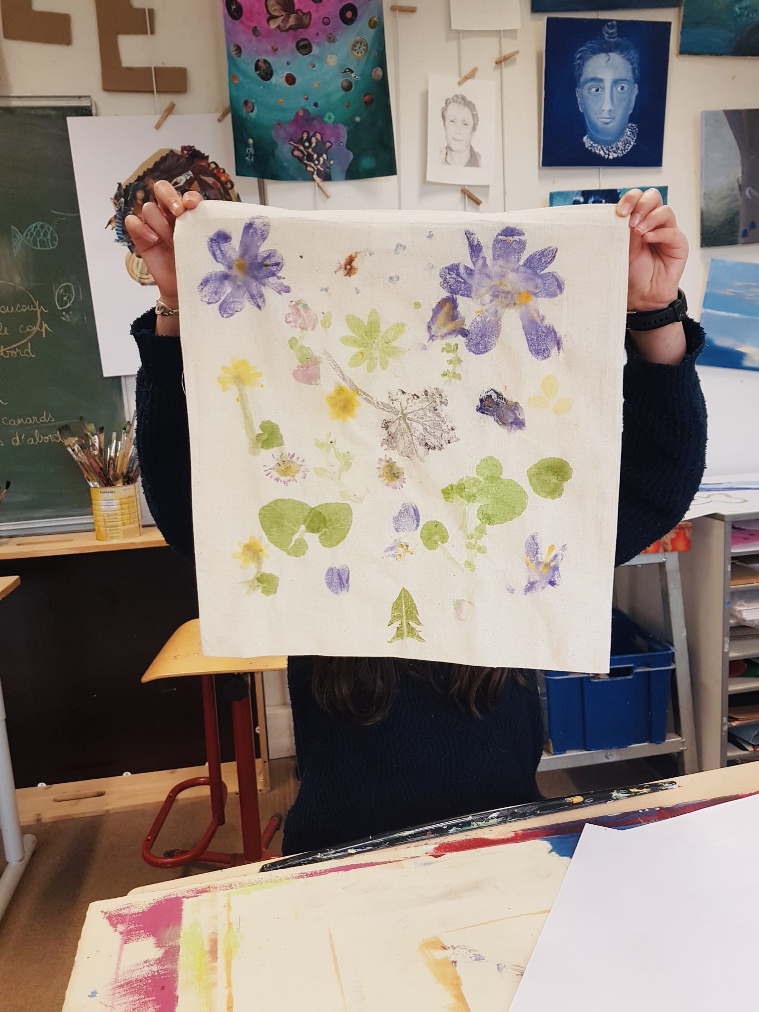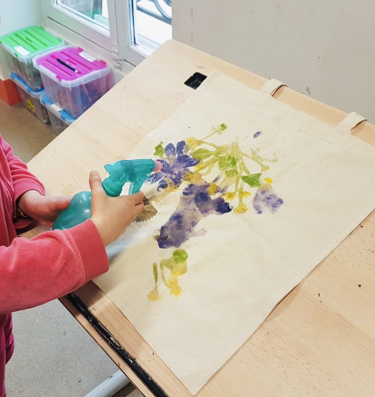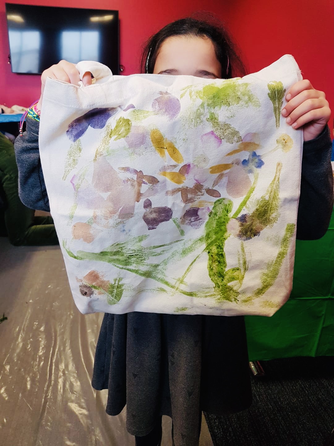 Nous cueillons des feuilles, herbes et fleurs lors d’une ballade dans un parc puis nous imprimons les fruits de notre récolte sur un sac en coton blanc, en tapant au marteau. L’empreinte du végétal et la couleur s’imprime sur le textile!