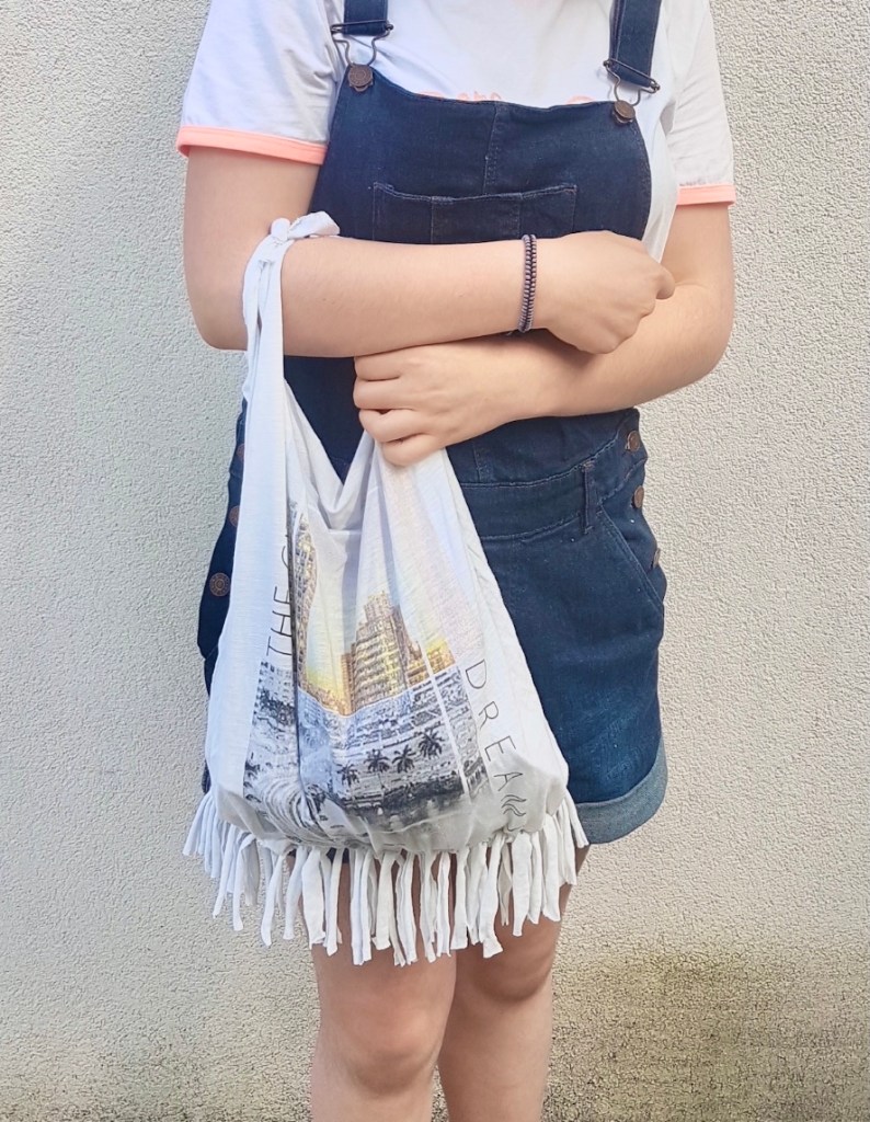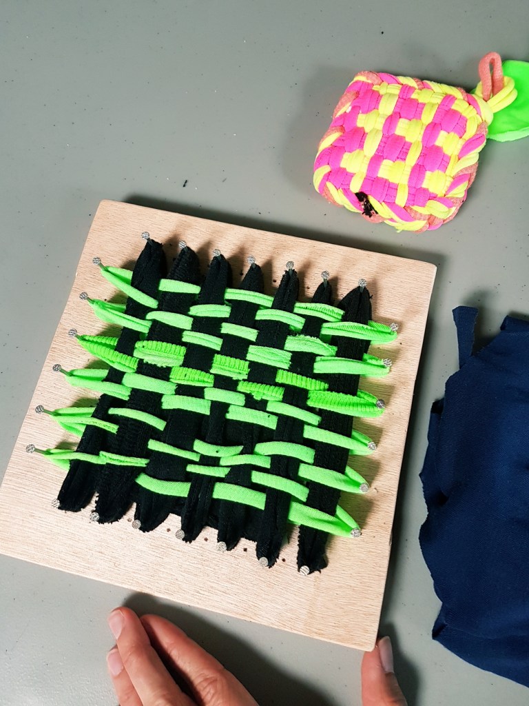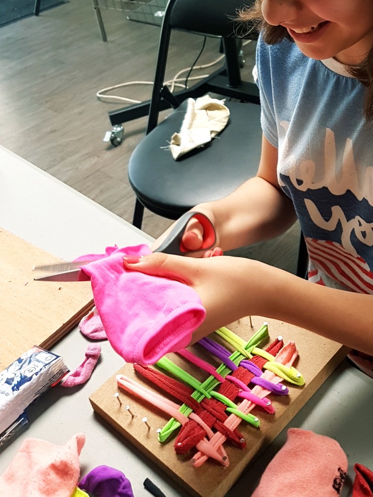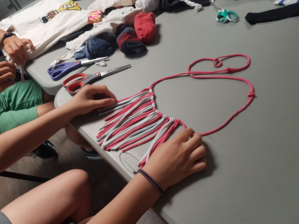 Recyclage de vêtements : création de bijoux, sacs de plage, éponges japonaises tawashi, suspensions en macramé, customisation de t-shirt, initiation au tissage à partir de pelotes de coton découpées dans de vieux t-shirts.